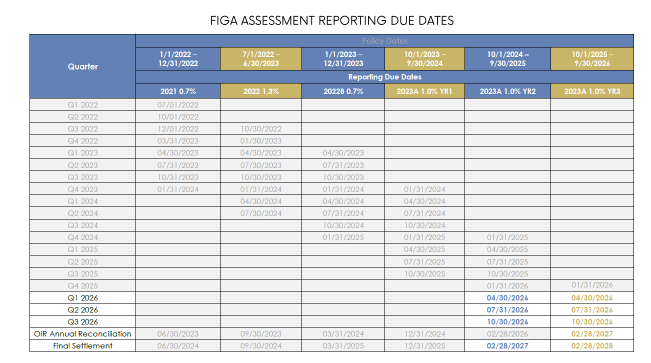 FIGA will continue to collect the emergency assessment on policies with effective dates through 9/30/2026. Quarterly reporting, as well as the annual reconciliation filings, will remain in place until a final reconciliation for premiums has been completed in February 2028.